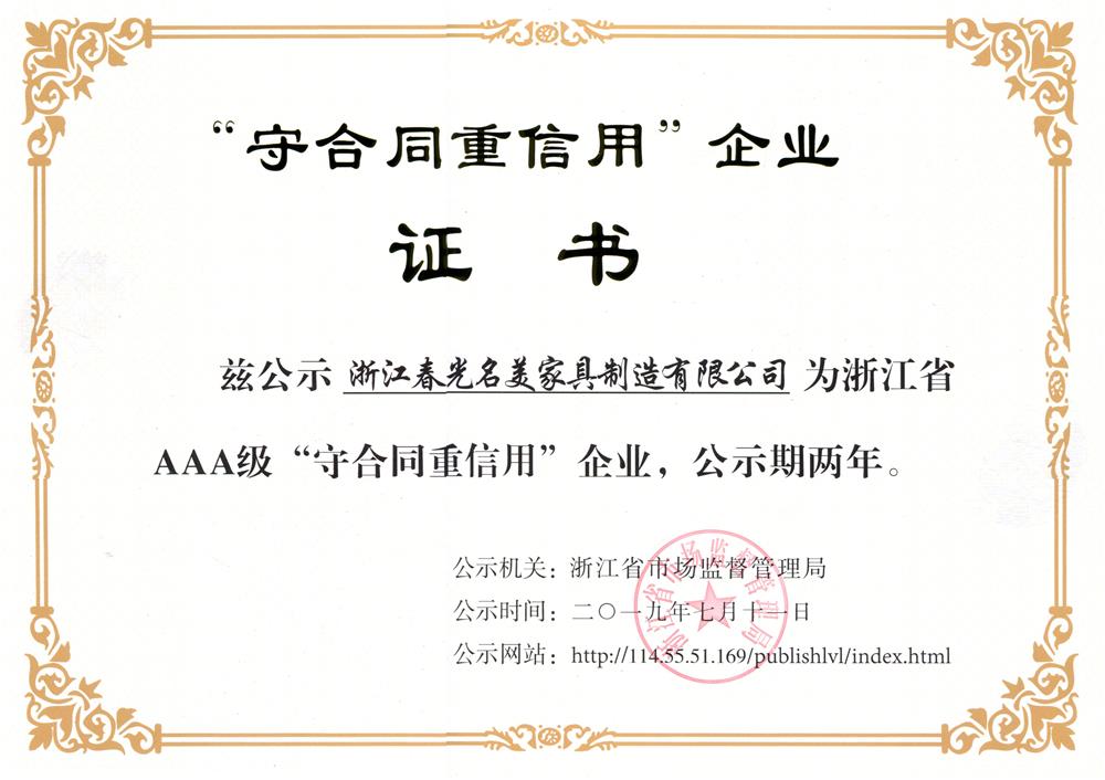 2019年7月 浙江春光名美家具制造有限公司荣获浙江省“守合同重信用”企业