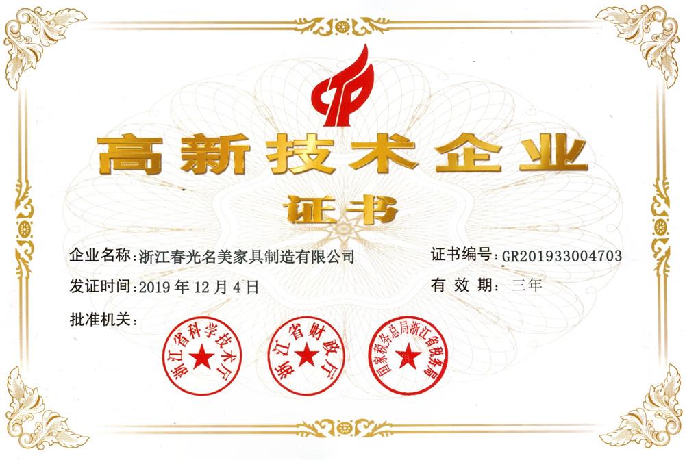 浙江春光名美家具制造有限公司荣获“高新技术企业证书”