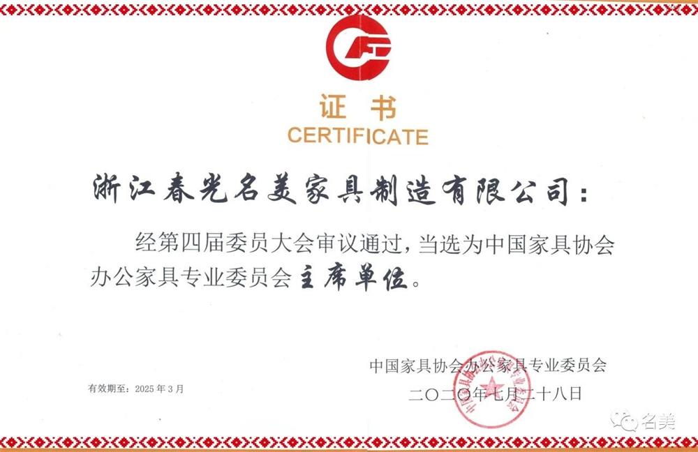 浙江春光名美家具制造有限公司 当选为中国家居协会办公家具专业委员会“